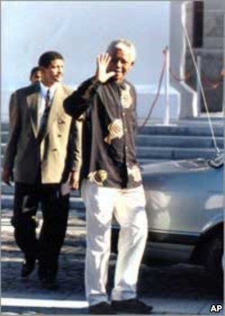 Nelson Mandela waves to supporters shortly before being inaugurated as South Africa’s first democratic president … He’s wearing his very first ‘Madiba shirt,’ given to him by Cape Town fashion designer Desre Buirski